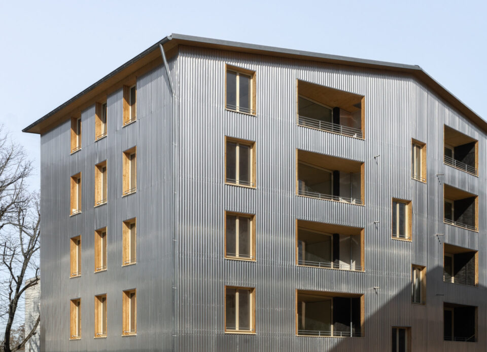Die beiden ungleichen Zwillinge des Reallabors Holz Ziegel Lehm in Berlin Alt-Britz nehmen immer mehr Gestalt an: Nachdem der Innenausbau nun weitgehend abgeschlossen ist, haben die Gebäude ihre charakteristischen Fassaden erhalten. Das massive Ziegelhaus präsentiert sich mit einer handwerklich ausgeführten Putzfassade, während das leichte Holzhaus in eine schimmernde Aluminium-Wellprofil-Fassade gekleidet wurde.
