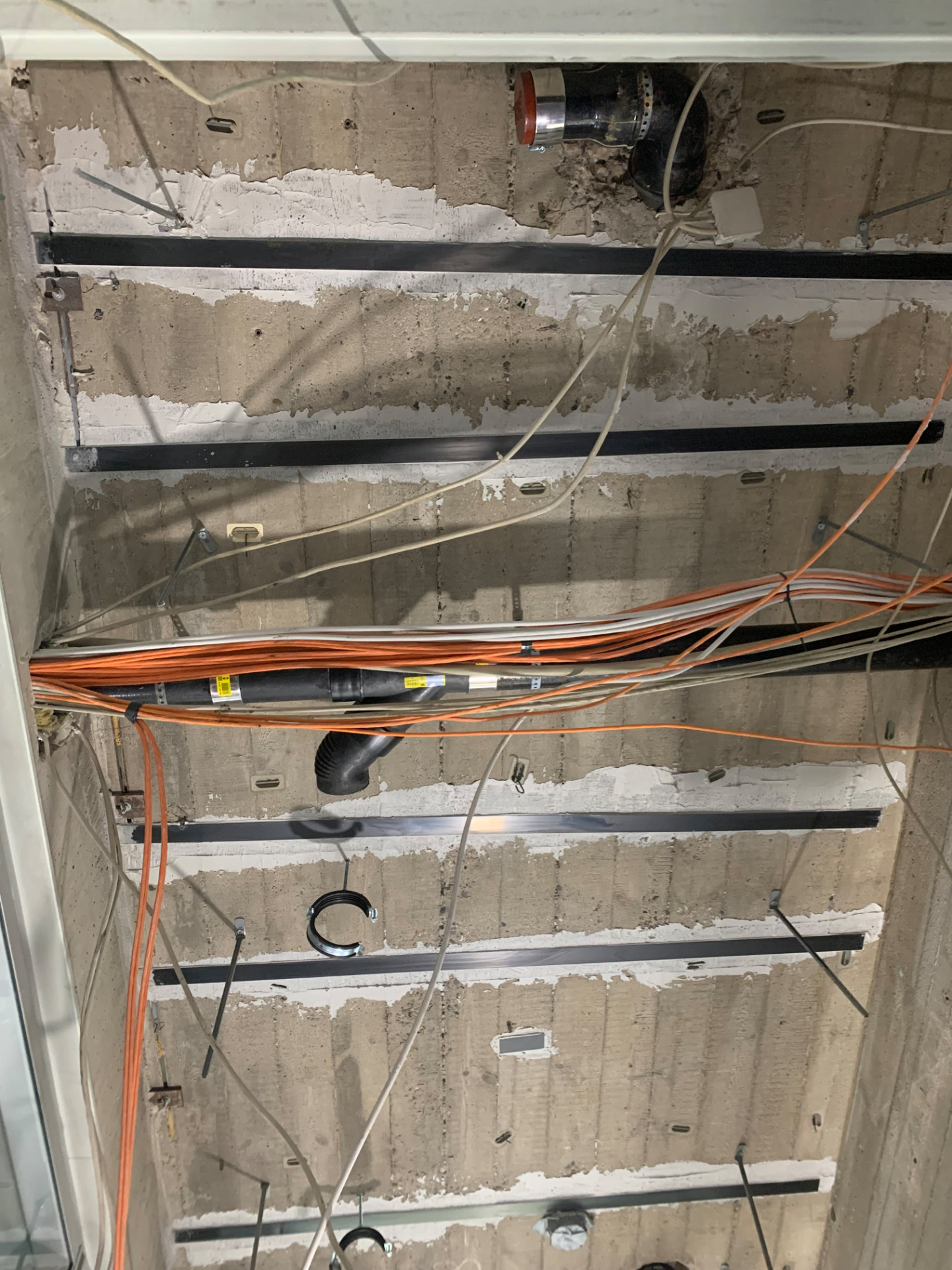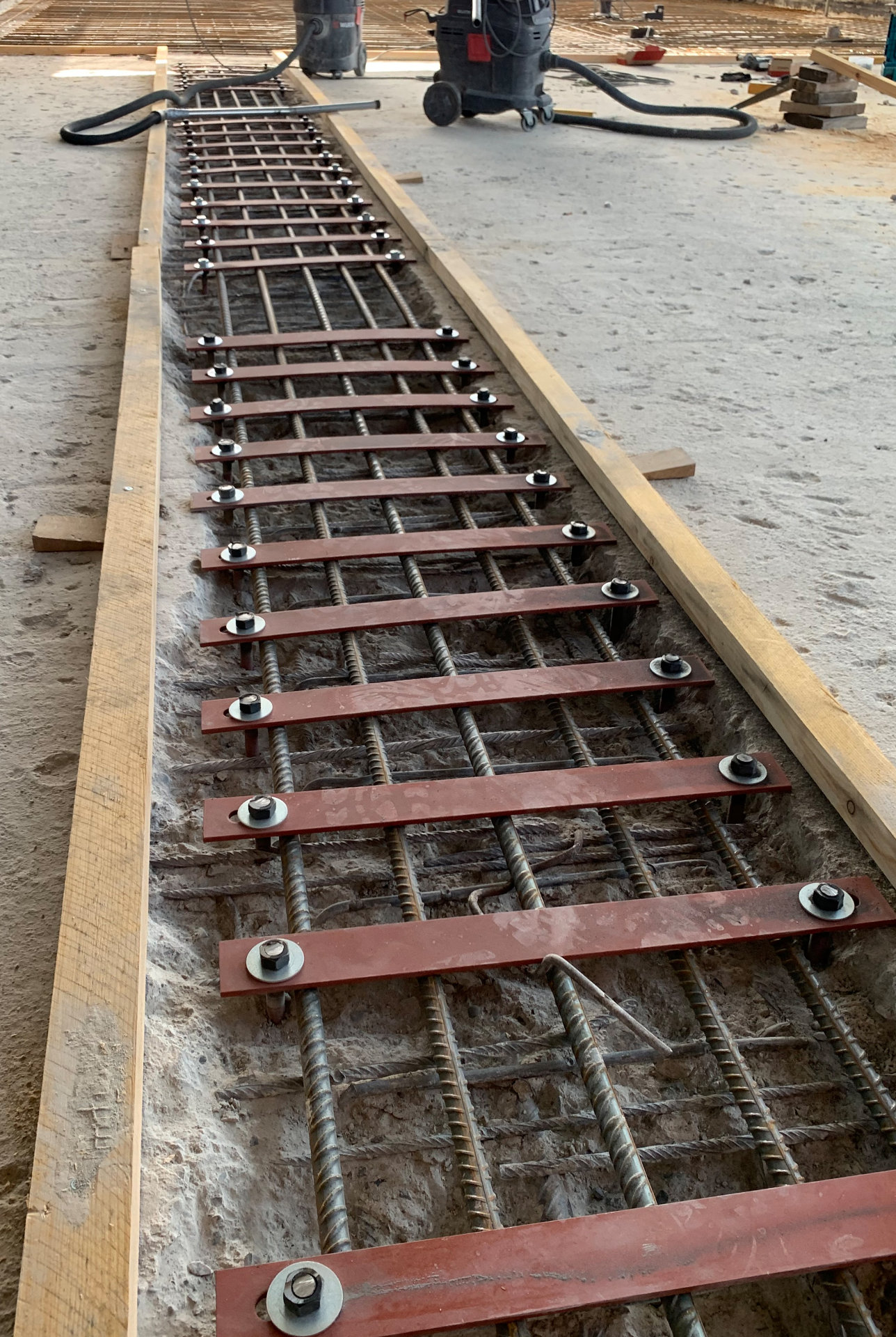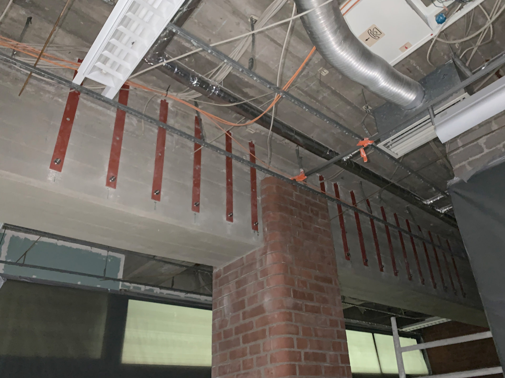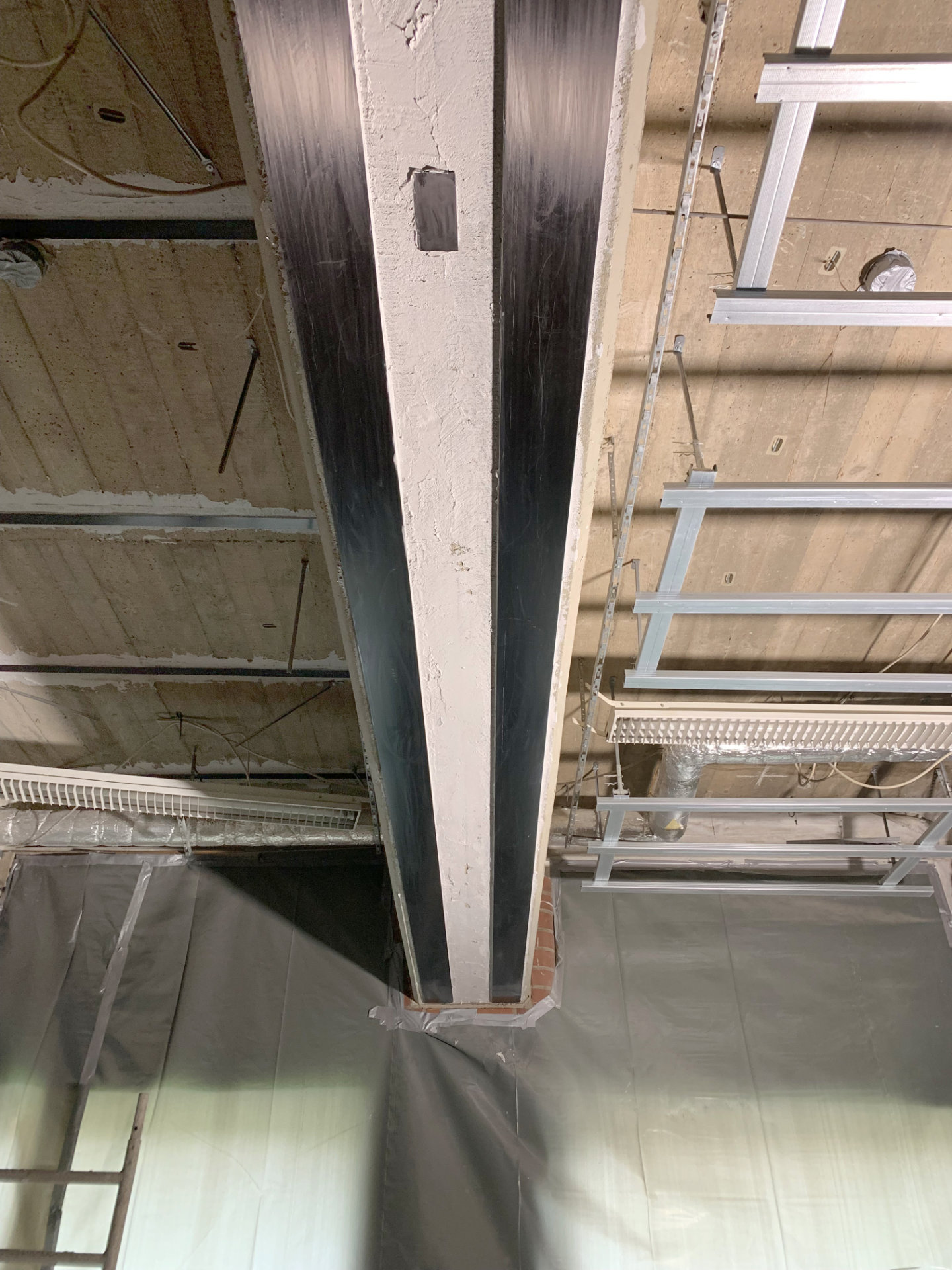 Auch die am Lastabtrag beteiligten Plattenbalken wurden ertüchtigt. Im Zugzonenbereich kamen ebenfalls aufgeklebte CFK-Lamellen zum Einsatz, im Stützmomentenbereich wurde die Tragfähigkeit durch im Aufbeton integrierte Bewehrung erhöht. Zur Querkraftverstärkung wurden speziell konstruierte Laschenbügel mit angeschweißten Gewindestangen eingebaut, die die obere Verstärkungsbewehrung umschließen und die Schubtragfähigkeit erhöhen. Aufgrund hoher Brandschutzanforderungen und geringer Betondeckung im Bestand wurden die Unterzüge zusätzlich mit Brandschutzplatten bekleidet, um eine ausreichende Überdeckung der Bestandsbewehrung im Brandfall zu gewährleisten.