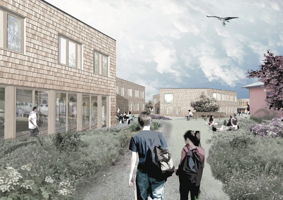Die Freie Waldorfschule Kleinmachnow soll in zwei Bauabschnitten um eine Mensa, Verwaltung, Oberstufe, Mittelstufe sowie einen Hortbereich erweitert werden. Im gegenwärtigen Zustand präsentiert sie sich als landschaftsbetonter Campus mit kleinmaßstäblichen, funktionsbezogenen Einzelhäusern.