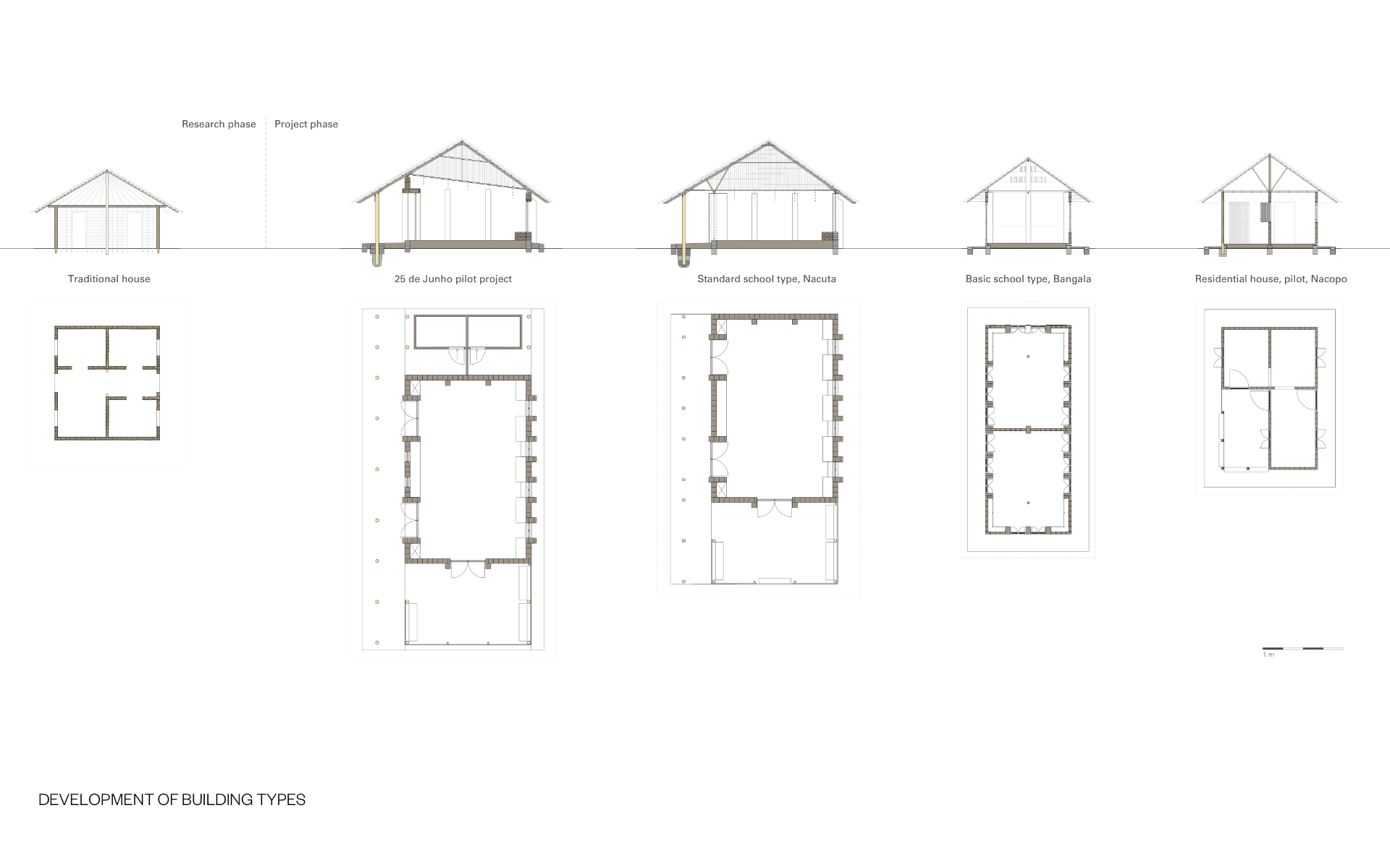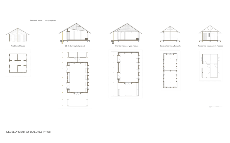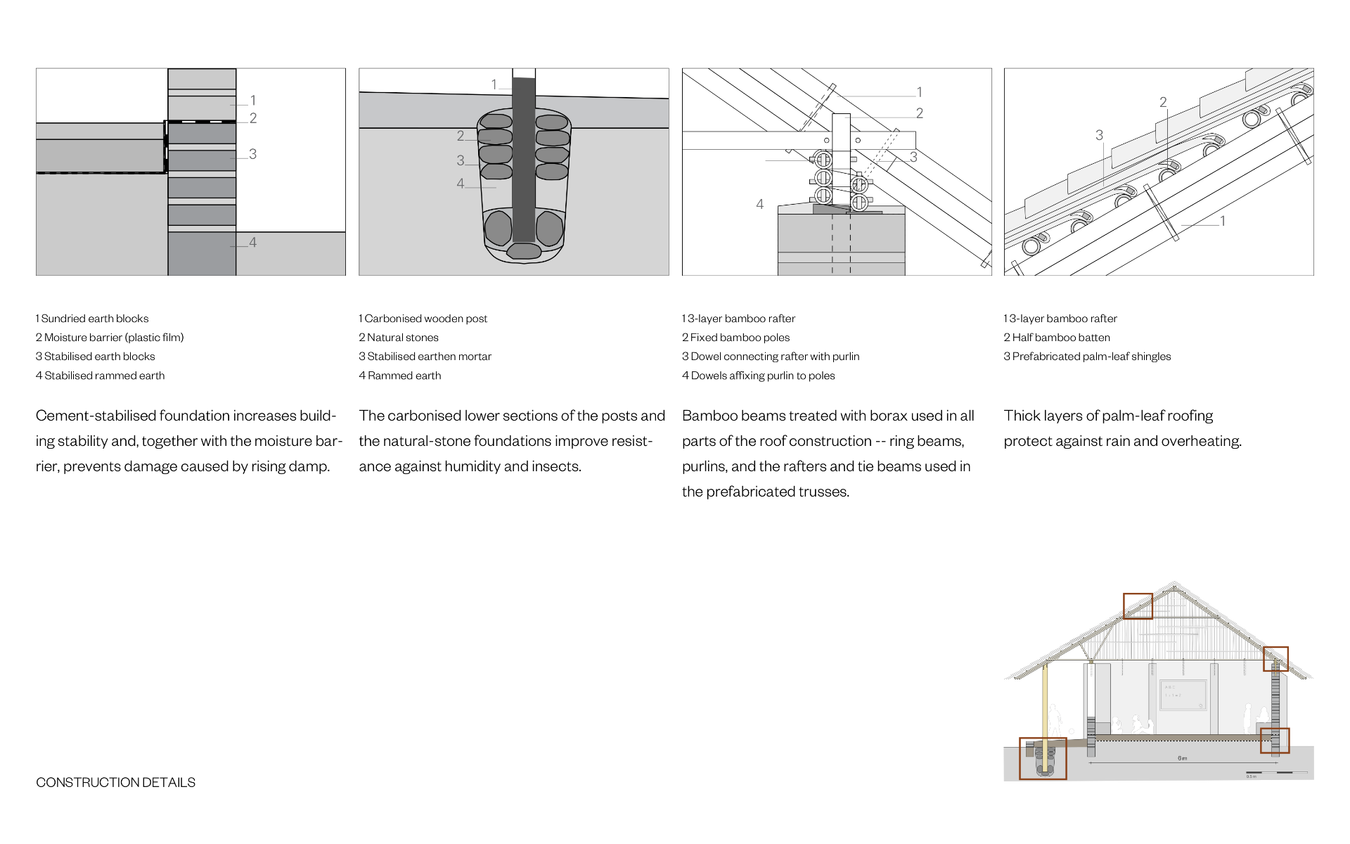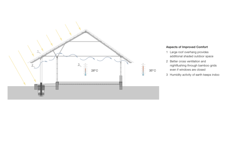 Simple improvements were made to the traditional building typology such as the introduction of a damp proof course and termite protection for timber and bamboo elements, furthermore a roof system was developed which can span 6,0m. As such the new typology is a logical and more durable extension of the local tradition and opens up new possibilities for construction for local actors.