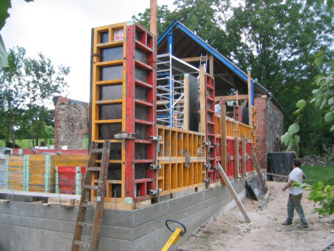 In an intensive collaboration with the clients and with the support of local authorities, ZRS were able to add a rammed earth extension to this historic rubble-stone masonry barn in the village of Ihlow in Brandenburg. The new extension replaces a previously damaged timber part of the structure and thus restores the geometry of the historic farmyard. The extension was the first residential building constructed in a load-bearing rammed earth construction in Germany since the emergency construction measures following WWII.