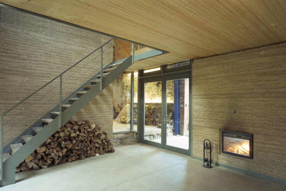 The existing masonry part of the barn remains as an unheated space in its original configuration. The ground floor of the extension is formed from load-bearing rammed earth on a concrete foundation, while the first floor is composed of a lightweight timber frame structure with a hemp insulation. The centre of the house is the kitchen block also formed from rammed earth. Through the maximised use of natural building materials such as earth, timber and hemp, the building’s reliance on fossil fuels could be drastically reduced. The minimal primary energy requirements of 24Kwh/m2 can be met using passive solar strategies and solar collectors further complemented with a central fireplace.
