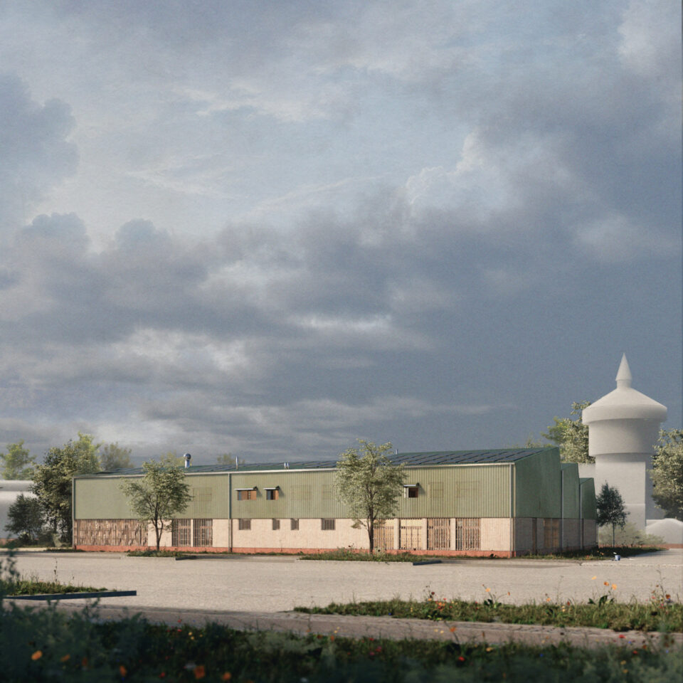 The new building is designed primarily with natural and reused materials and components. It will be constructed as a timber frame structure with two different roof types: a sawtooth roof over the main hall and a gable roof over the side wing. The roofing and façade will include approximately 1.000 m² of reused corrugated iron, previously used as façade cladding for a commercial building in Munich. On the ground floor, the façade cladding will consist of reused structural timber from old pine roof trusses. Future maintenance work can be carried out by the users themselves using offcuts from the on-site woodworking shop. The infill of the timber-frame interior walls will be built using earth bricks, which will also be produced by the users themselves.
