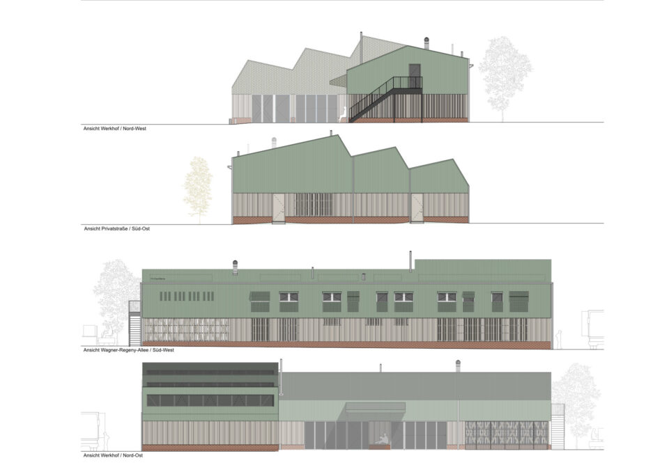 The “Bauhof” is a workshop complex of the International Youth Heritage Conservation Centre Berlin (Internationale Jugendbauhütte Berlin) for conducting practical seminars and projects in the fields of traditional craftsmanship and monument preservation. The new building is part of a larger ensemble on the site of the former Schöneweide railway depot, an industrial heritage site. It comprises a woodworking shop, a forge and metal workshop as well as a shared lounge. The workshop building is just one component of the overall project “DampflokWerk”, a future seminar center that will include accommodation, a canteen and seminar rooms for training and educational programs in traditional crafts, industrial and railway culture. As part of this project, the restoration of three auxiliary buildings and outdoor areas on the Schöneweide railway depot site is likewise planned.