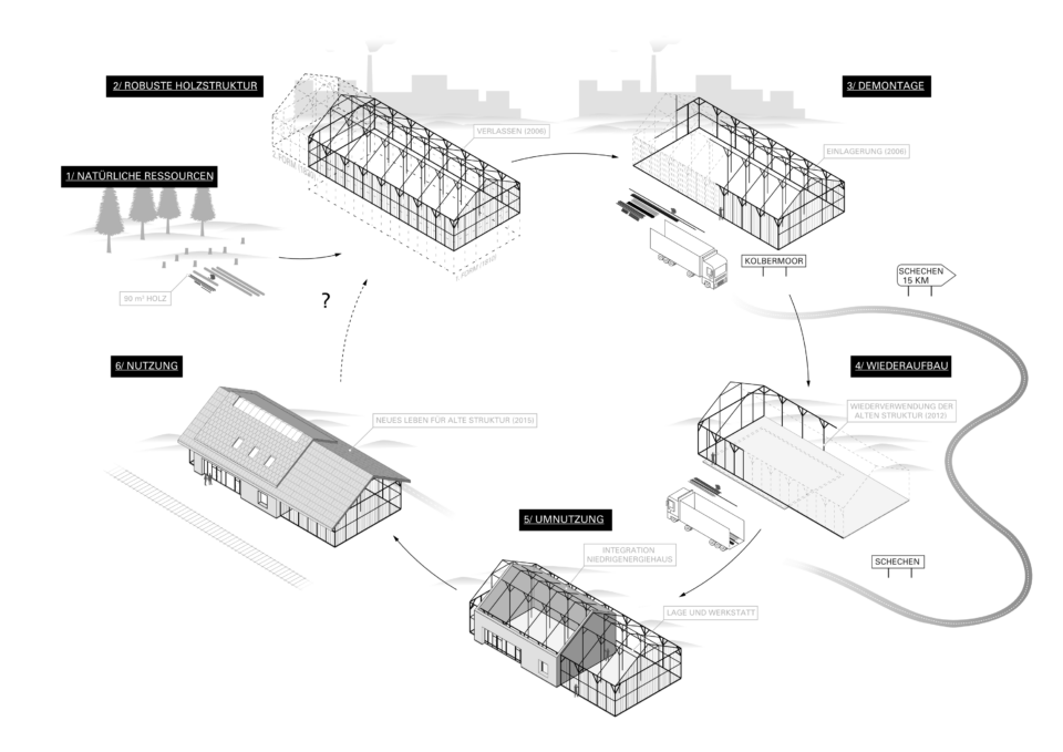 In Kolbermoor the clients rescued a historic peat barn that was in danger of demolition and disposal. The barn was dismantled, repairs undertaken throughout and then reassembled 15 km away in Schechen. The building fits seamlessly into its new context next to the station. Through the addition of a new highly insulated building shell, the barn becomes a home and workshop for basket weaving.