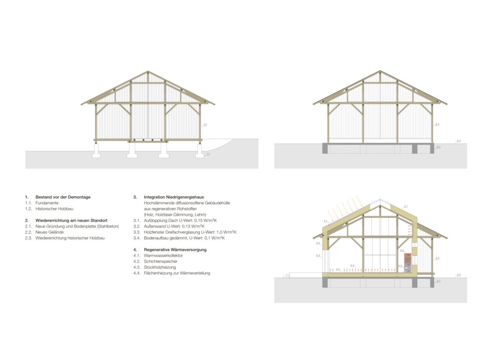 A higher insulation standard and the regenerative wood burning heating system make the house a model for sustainable building. The improvement and re-use of a historic structure shows the potential contained in historic timber buildings. The utilised natural materials afford a comfortable and healthy interior climate and avoid the need for mechanical ventillation systems. The finished house operates at 30% below the strict German EnEv 2009 standard.