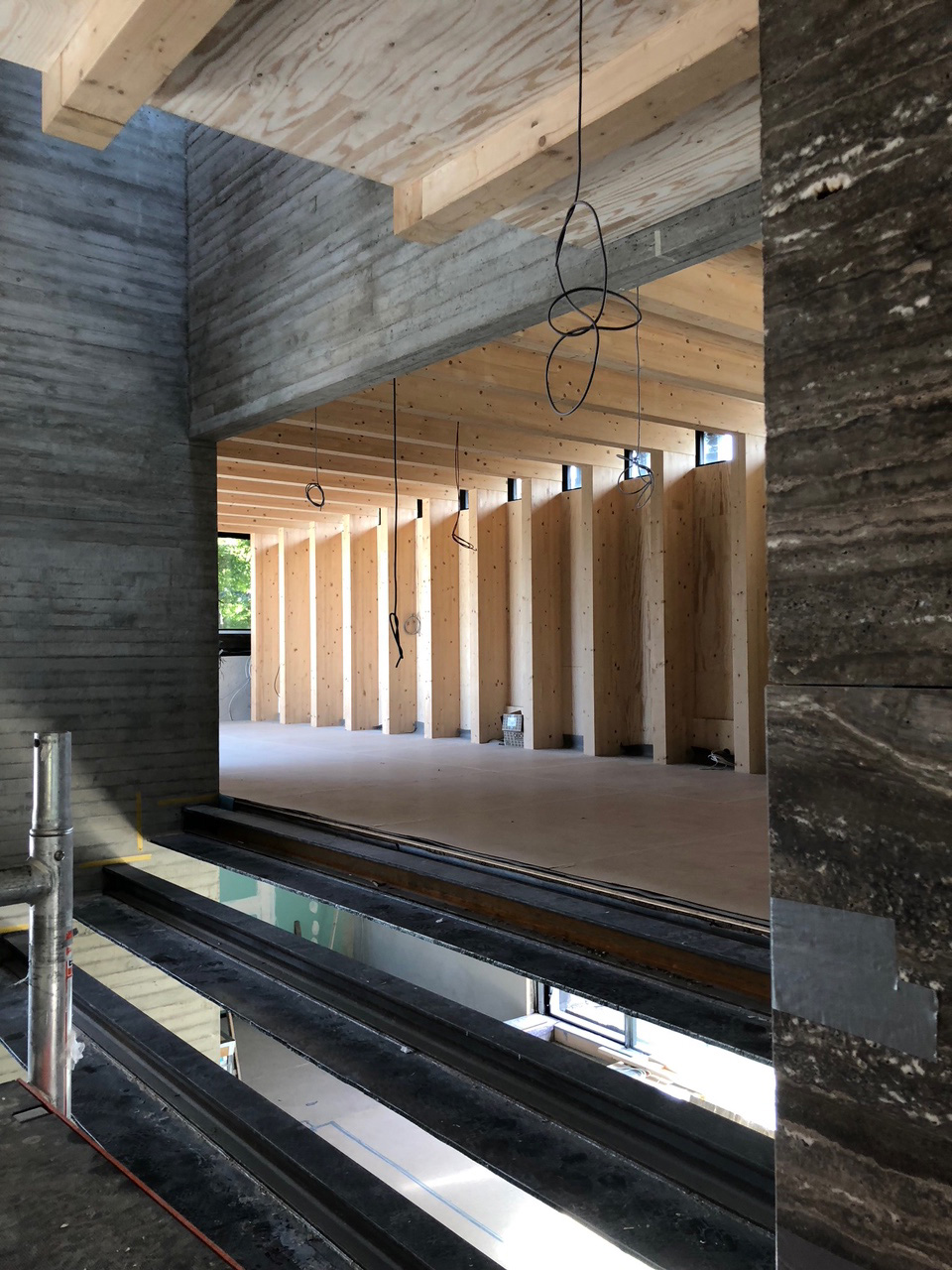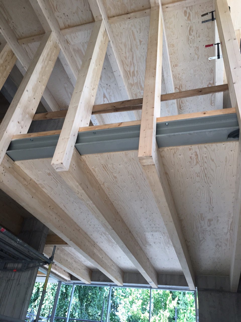 A reinforced concrete construction of ceilings and walls combines the core, with timber- and structure elements attached to it.