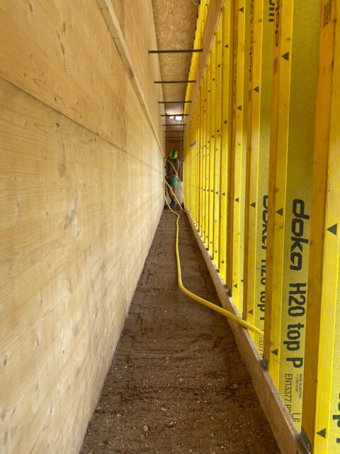 As is usual with high-bay warehouses, the building is braced by it. In order to reduce the buckling length of the rammed earth wall, two ring beam levels made of reinforced concrete were integrated. They transfer the horizontal loads into the high racks and the side walls via fixing points. One challenge in the design of the rammed earth walls was to estimate the interaction between the “soft” inner timber structure, i.e. the high-bay racking, and the “stiffer” surrounding rammed earth wall.