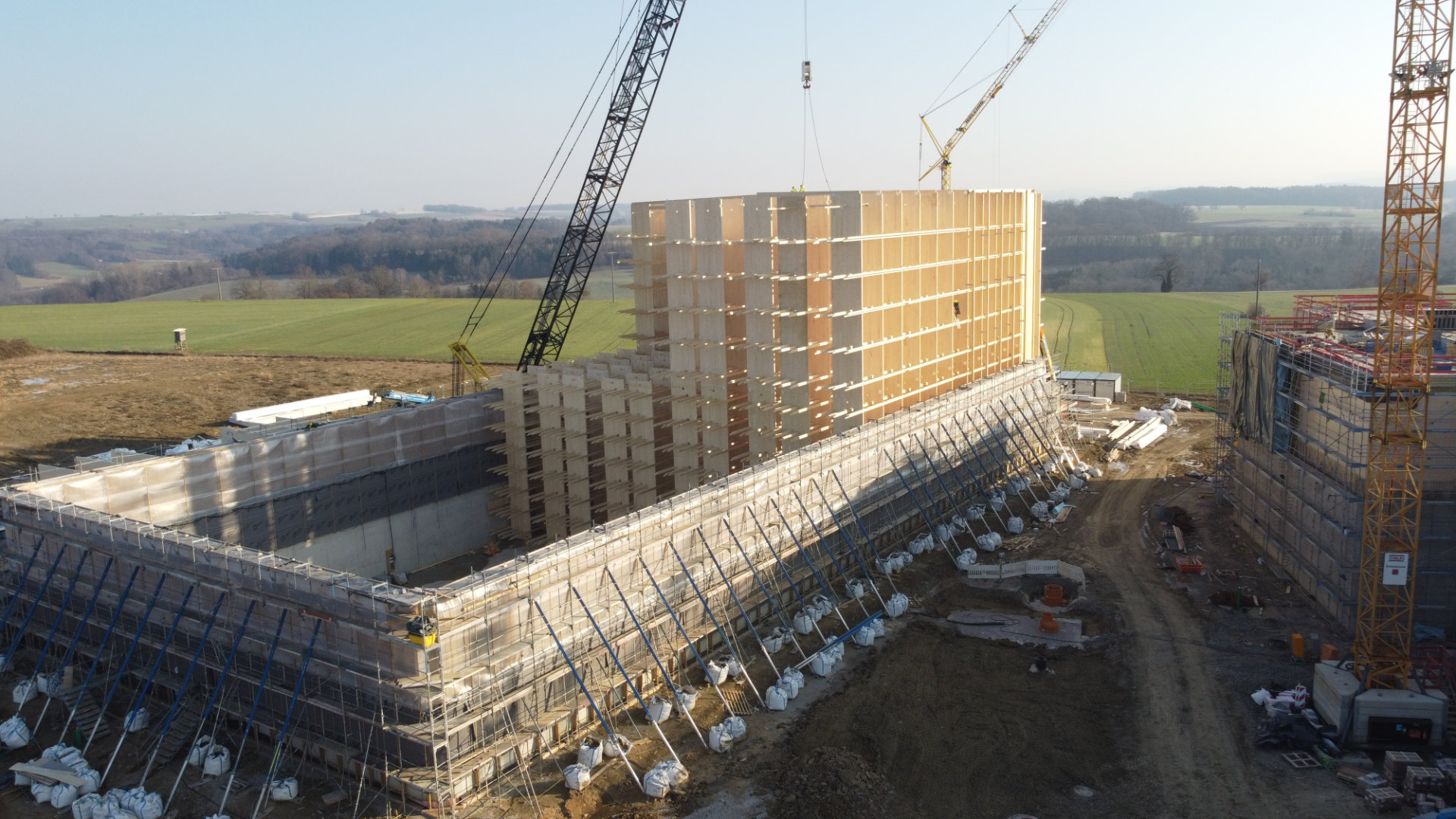 At 82 x 38 metres, the new Weleda central warehouse in Schwäbisch-Gmünd is the largest continuous rammed earth building in Germany. The surrounding rammed earth walls with a height of 8 metres are part of the 31 metres high building envelope. It extends 5 metres into the ground with a reinforced concrete trough and continues above the rammed earth walls with a further 18 metres of insulated timber façade. These various construction elements are combined to ensure that the building does not require any cooling or heating during operation for the sensitive cosmetics and pharmaceuticals produced by Weleda.