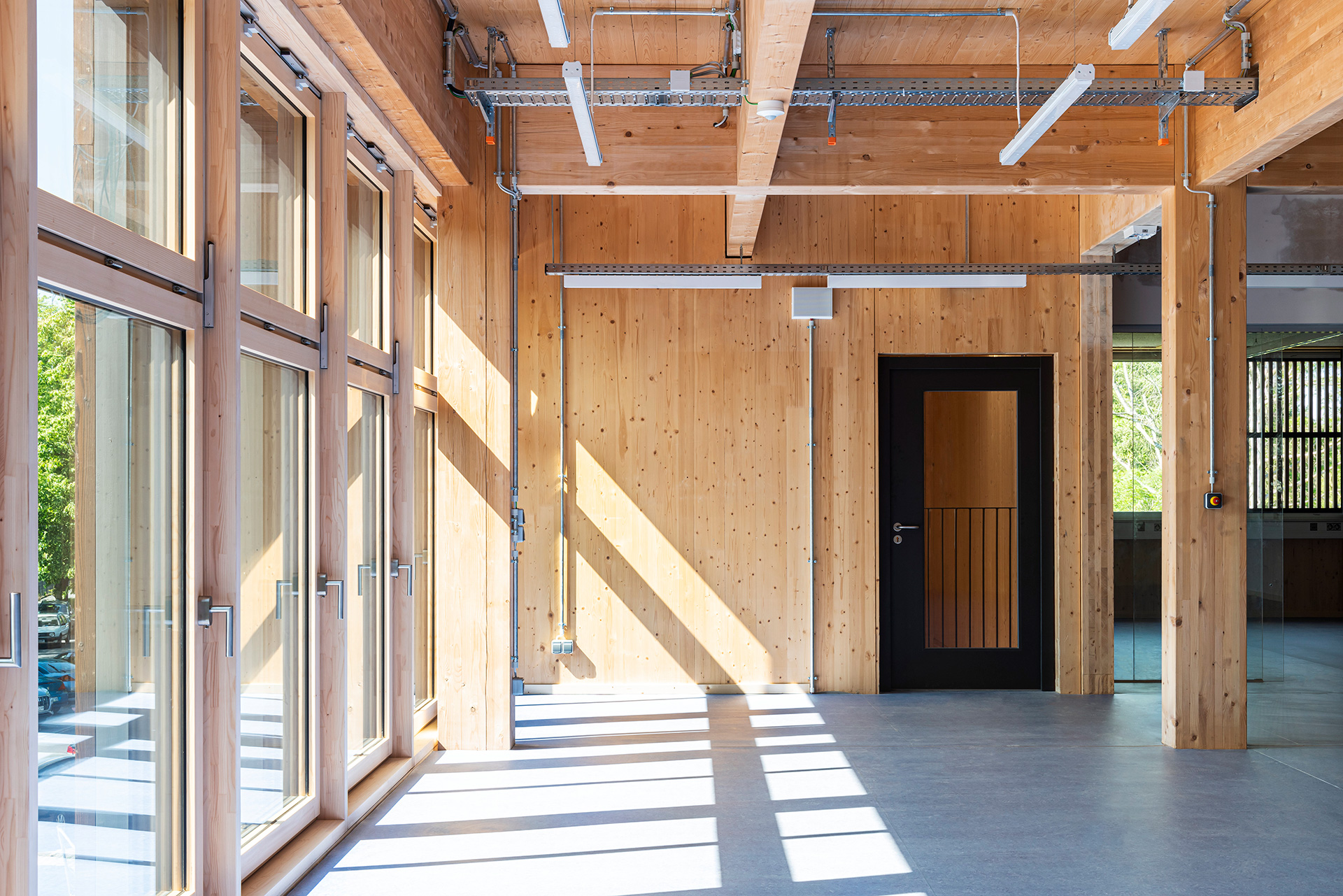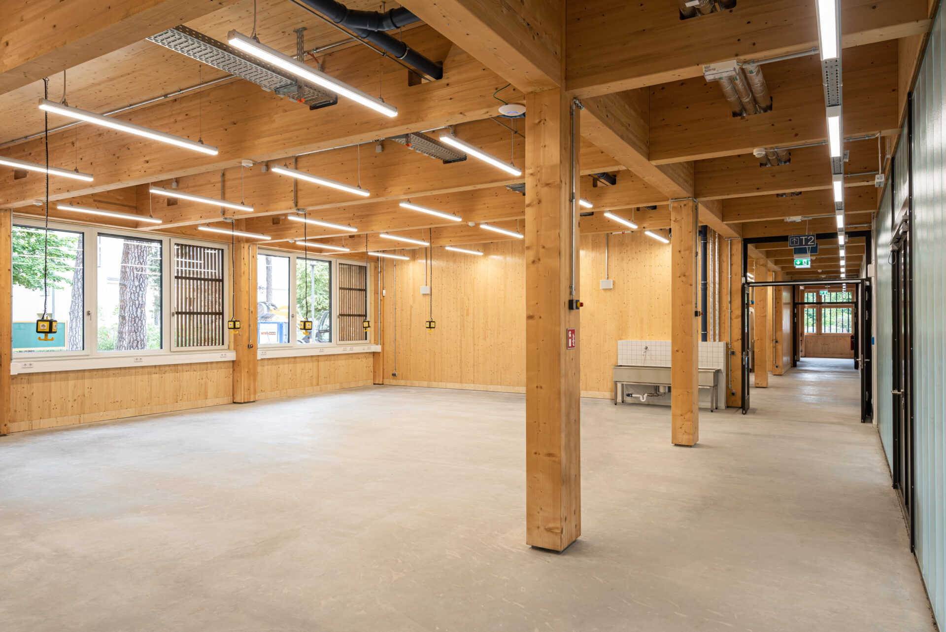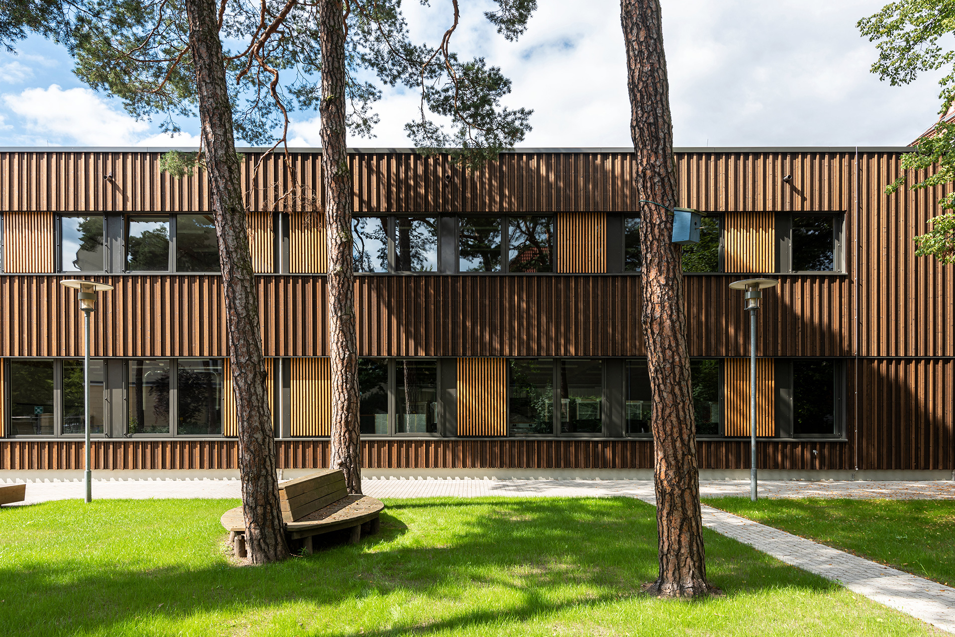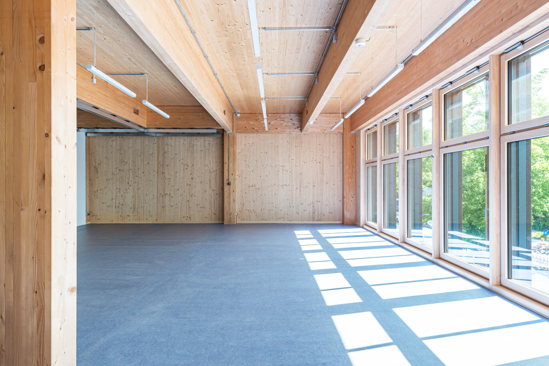 The central idea of this project was the development of a building that can respond to changing spatial requirements and environmental influences in the future. The result is a modular construction with a large support span, offering a high degree of flexibility for future conversions. The house is built entirely of timber with a minimal ecological footprint. Room humidity and indoor temperature are controlled by a diffusion-open construction method and natural window ventilation. Thus, expensive and high-maintenance technology such as ventilation and air conditioning systems are not needed here. The concept of combining renewable building materials with a robust and simple construction method has a pilot character in the realization of school buildings. The use of natural building materials on the interior and exterior visualizes the sustainable construction method to the public and makes wood as a building material tangible for the users.