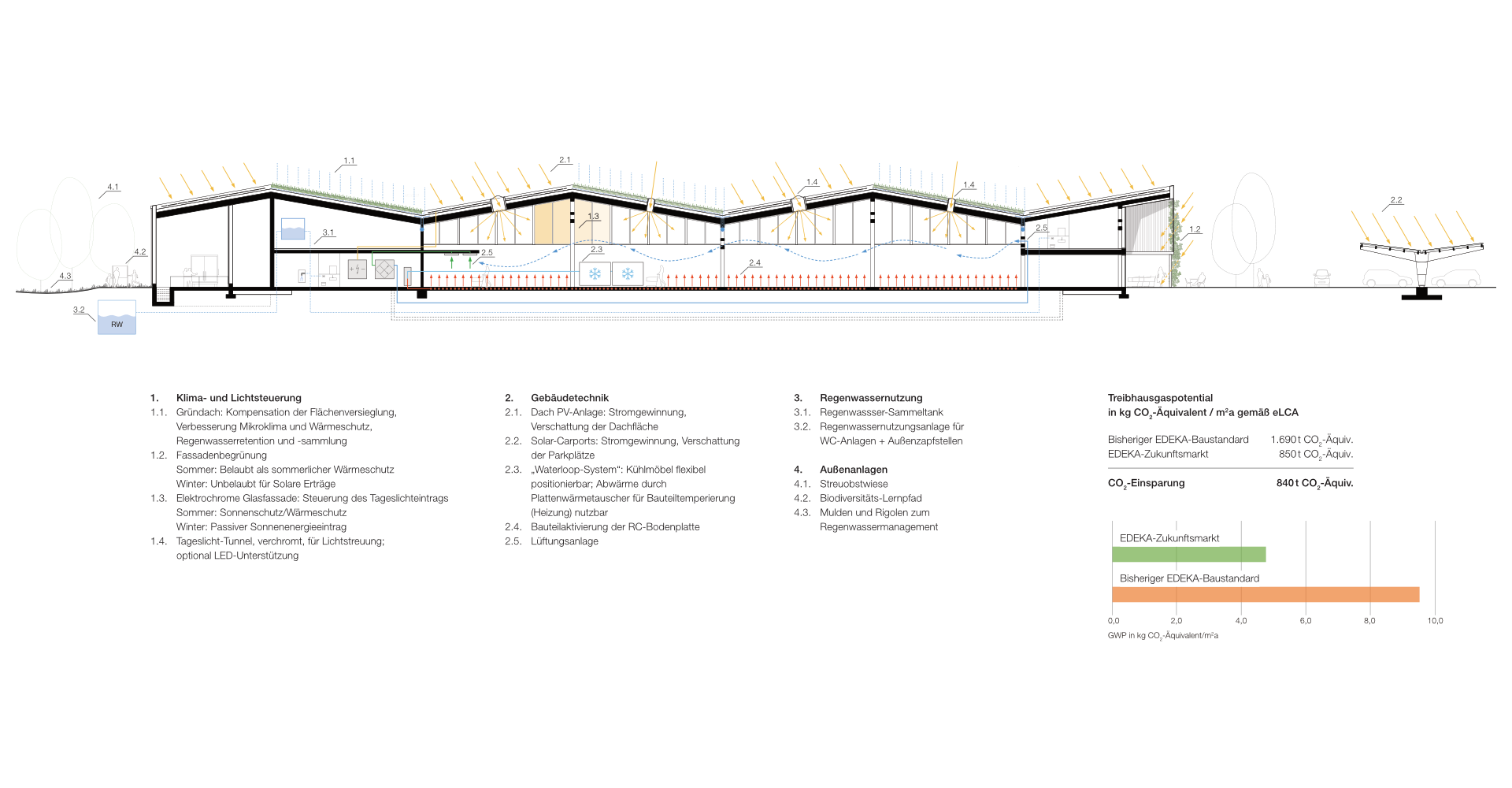 Auch dem Thema Gebäudebetrieb wurde mit hohem Anspruch an eine nachhaltige Konzeption begegnet. Hölzerne Solarcarports auf dem Parkplatz und eine Photovoltaik-Anlage auf dem Dach mit Batteriespeicher liefern Strom. Regenwasser wird unter anderem für die sanitären Anlagen und die Bewässerung der Außenanlagen genutzt. Eine intelligente Gebäudeautomation für Heizung, Lüftung, Klima und Beleuchtung sorgt für kontrollierte Bedingungen. Die Kühlmöbel sind an ein flexibles Schlauchsystem angeschlossen, sodass sie nicht ortsgebunden gestellt werden müssen. Die Abwärme des wassergeführten Systems wird genutzt, um im Winter den Markt zu heizen.