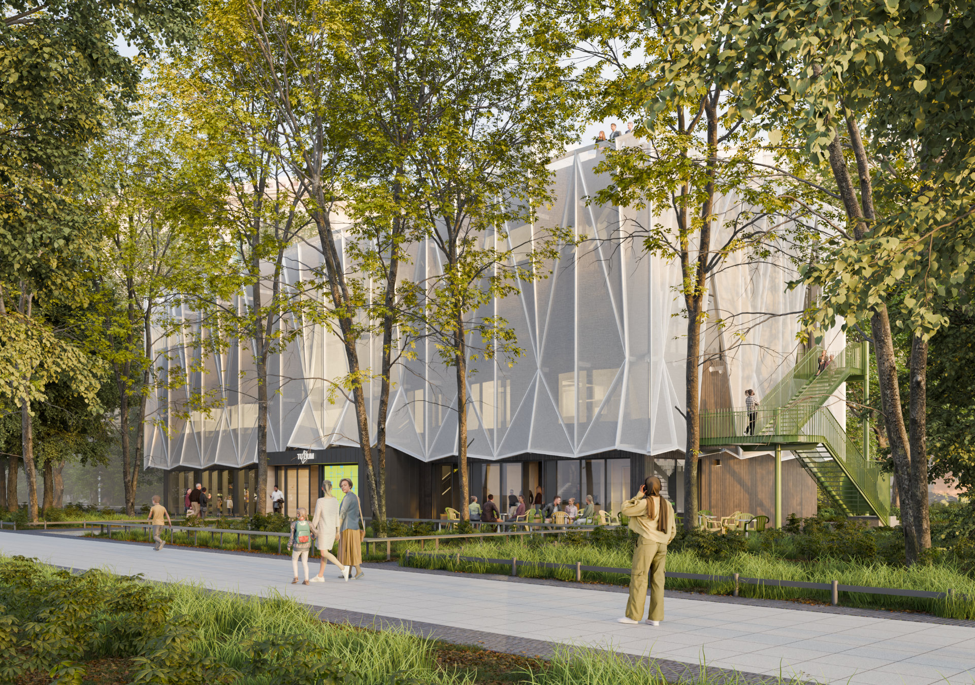 Der Pavillon wird als beispielhaftes, klimagerechtes Gebäude geplant und ist Reallabor für nachhaltiges Planen und Bauen. Er wird ausschließlich aus nachwachsenden Roh- und Baustoffen, wiederverwendeten Recyclingmaterialien und mit möglichst geringem Fußabdruck realisiert. Die nachhaltige Planung soll für Besucher*innen erfahrbar sein – das innovative Tragsystem aus Altholz wird zum gestalterischen Element, in der Gründung wird weitestgehend auf Versiegelung, Beton und Stahl verzichtet und das Gebäude als LowTech Haus konzipiert.