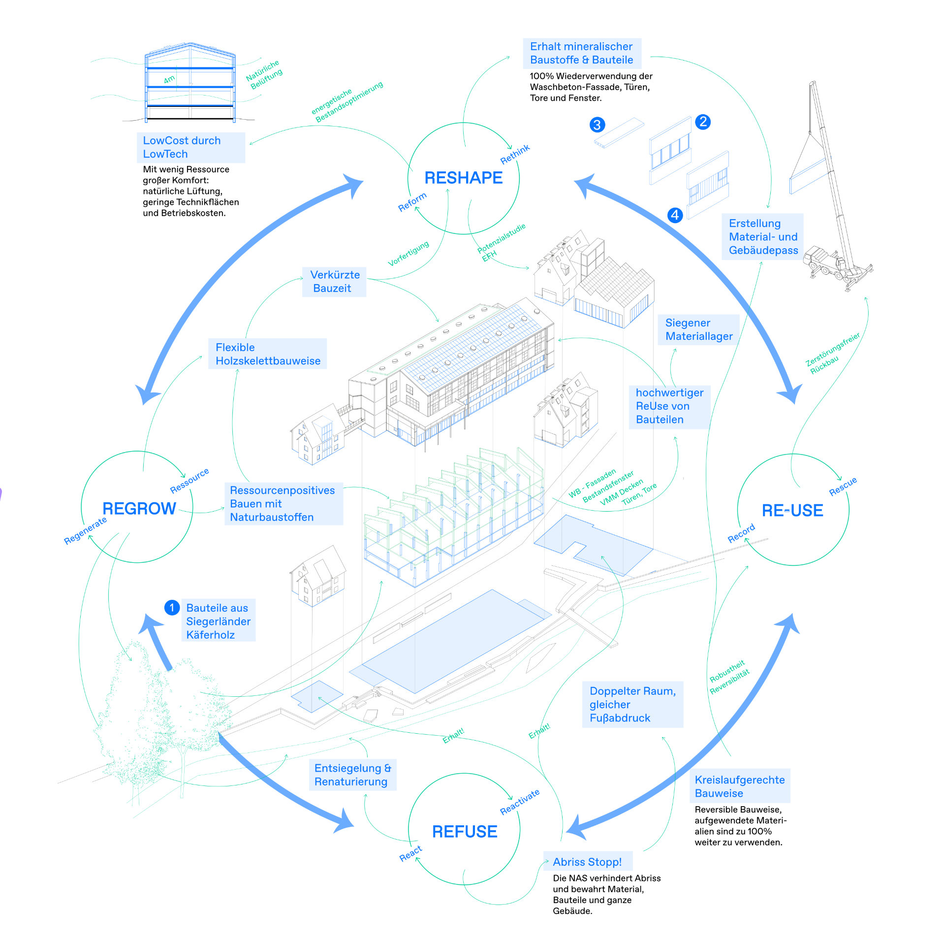 Der Entwurf von coopdisco + ZRS Architekten versteht die Neue Architekturschule Siegen (NAS) als Reallabor für die Bauwende und umfasst neben der Gebäudeplanung auch ein alternatives Prozess-Design. Durch den Einbezug der Universität in die Planung und den Umbau wird ein innovatives, übertragbares Konzept für praxisorientiertes Lernen und Wirken am eigenen Haus entwickelt – das Siegener Modell.